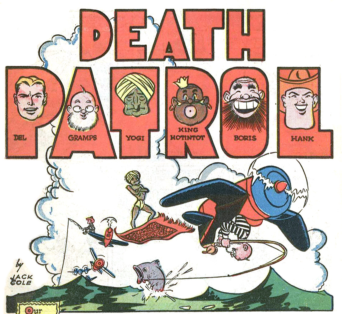 The creation of Death Patrol is documented with contradiction. Anyone reading Military Comics #1 will notice the similarities between this feature and the lead, “Blackhawk.” Both strips were populated by multinational bands of aviators, but they differed greatly in tone. It’s impossible to say whether Jack Cole was aware of Blackhawk when he created the Death Patrol. If he did, it might have been at the direction of Will Eisner, who edited Military’s content. The author of Will Eisner’s biography, A Spirited Life, twice credited “Death Patrol” to Eisner’s studio, and the writing to Bob Powell. But this is rather discredited by the additional, erroneous statement that the feature “later became Blackhawk”; they were published simultaneously. Editor Gill Fox confirmed that Jack Cole created the feature, but had to abandon it soon thereafter. Fox added, “They started out killing a character in every ‘Death Patrol’ story, but Arnold got annoyed and decided to cut that out. I don’t think he liked that strip. I followed Cole and Dave Berg on that strip and wrote it, too. And what a pair of artists to keep up with! That’s pressure.” Freelancer Dave Berg took over for Military #4-12.