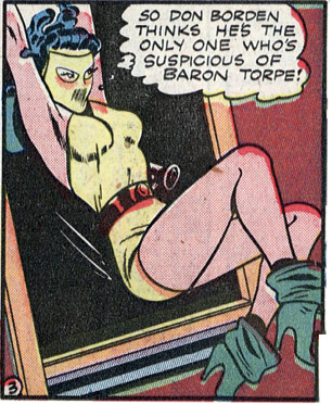 When Frank Borth took the helm on Phantom Lady’s adventures, he dispensed with Sandra’s new mask, but a domino mask appeared in Police #18, and was gone again the next issue. He also began a multipart adventure that crossed over with his other Quality feature, the Spider Widow. That case began with a series of attacks by an unseen mob boss on the life of Sandra’s father, at a party in the Senator’s home. (#17) Another spy attacked the Senator while dressed as the Easter bunny. (#18) After the next attack, it became clear to Sandra that she’d have to be more proactive in finding the man behind these attacks. They struck again while she was boating with her friends Jake (a comic strip artist) and Heidi on Lake Erie. Sandra took to the aquaplane (a platform for waterskiing) and was overtaken by men bent on revenge against her father. She stealthily donned her costume and commandeered another boat to round them up. (#19)