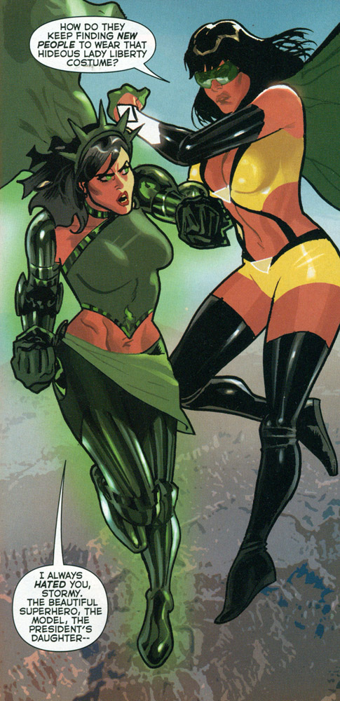Stormy Knight battles Lady Liberty, from Uncle Sam & the Freedom Fighters vol. 1 #5 (2007); art by Daniel Acuña.