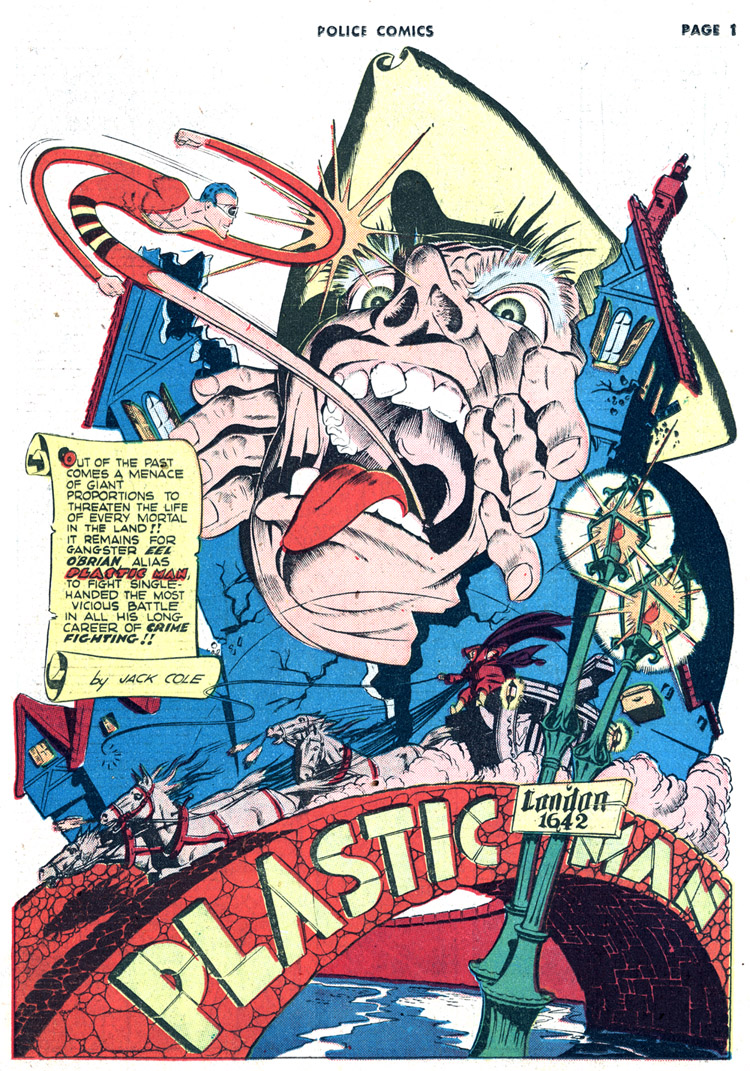 Plastic Man debuted in Police Comics #1, in the summer of 1941, as a six-page back-up feature. The cover star of that issue was Reed Crandall’s “Firebrand,” but that wouldn’t stand for long. The first installment was an origin story. Our hero—who began as a common criminal named “Eel” O’Brian—was orphaned when he was young, leaving him to fend for himself on rough streets. (Later stories explained that he earned his nickname by being so adept at eluding the authorities.) O’Brian was left behind by his gang at the Crawford Chemical Works, and after being shot and doused by acid, he limped to safety on a remote mountain. When he awoke, he found he’d been taken in by a monk at a place called Rest-Haven. The acid had imbued him with the incredible ability to stretch and mold his body into any shape! He saw the opportunity to turn over a new leaf and vowed to use these awesome powers to fight crime. When he left the Haven, his first mission was to take revenge against his former gang. He donned a red rubber suit and returned to infiltrate them. They were stunned by the freakish powers of Plastic Man and fled to their getaway car—which was driven by O’Brian. He promptly dropped them off (literally) at the nearest police station. (Police #1)