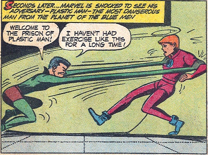 Plastic Man can change his body into any shape that he can imagine. His physical make-up was changed in such a way that his entire body was composed of the same malleable substance. His body could survive almost any attack of force, including projectiles or heavy pressures. As a balloon, he could create the effect of super-breath. In the beginning, he could change his color, as well. In tales at DC Comics, he has struggled with that aspect. Being made of a rubber-like substance, he was insulated from electromagnetic energies.