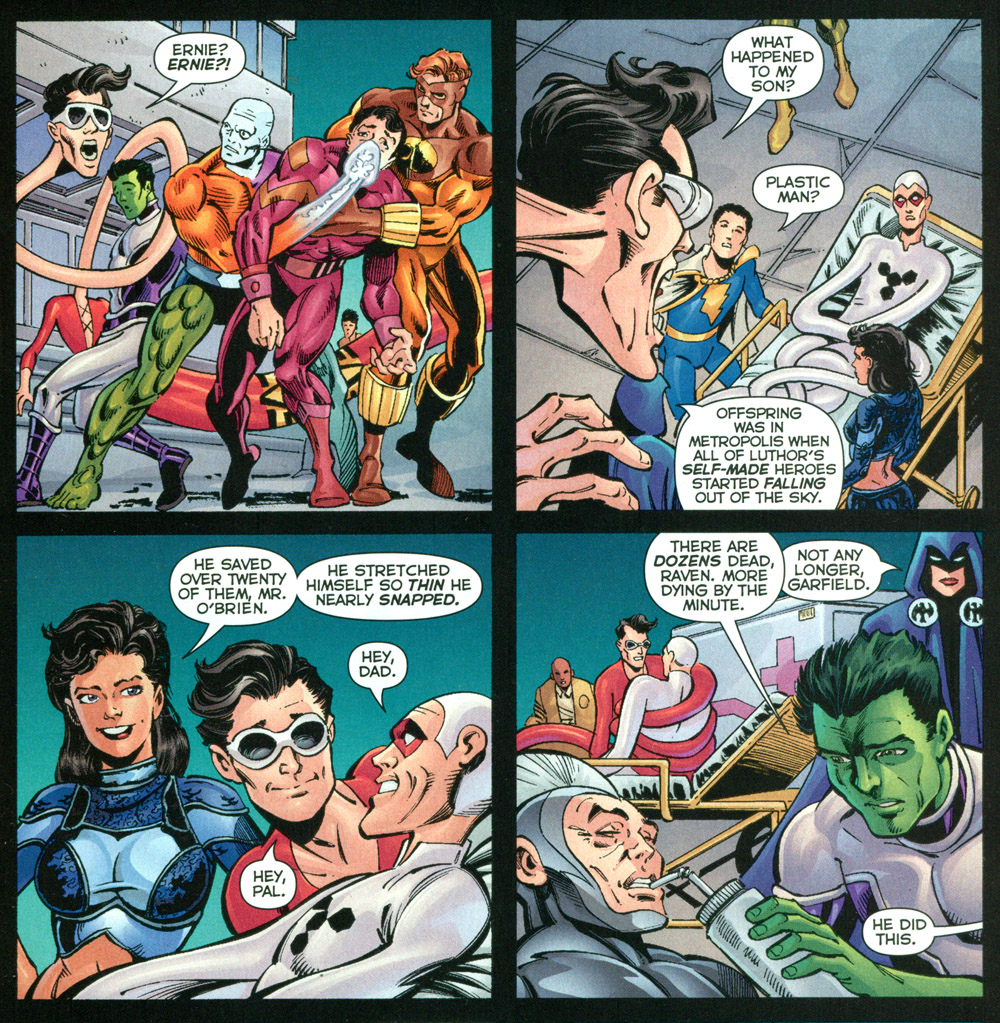 In the pages of JLA, Plastic Man’s personal life was explored more deeply than ever. When Mark Waid took over the series, he was even so bold as to finally give the hero a first name: Patrick (it happened in JLA #50). Waid said, “it just fit with the story—our first real good in-depth look at the pre-accident Eel.” Waid said that “Patrick” was the most Irish name he could think of (and regrets misspelling his last name throughout that tale). More surprising was the discovery that Plas had a son…