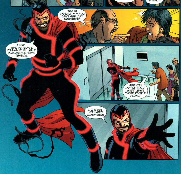 When it finally came time for Lucien to meet Chanti's parents, he made the ill-advised decision to change his appearance to appear Indian. This infuriated Chanti and did little to gain favor with her father. Later Chanti was kidnapped by a cadre of insectoid robots that fell from the sky. (#2) The Ray managed to free her, but afterwards at the hospital, they encountered the mastermind behind the kidnapping—Filmore aka the Director. Lucien refused Filmore's invitation to be Filmore's film star, and so the Directory unleashed his reality warping powers and killed Chanti's father. (#3)