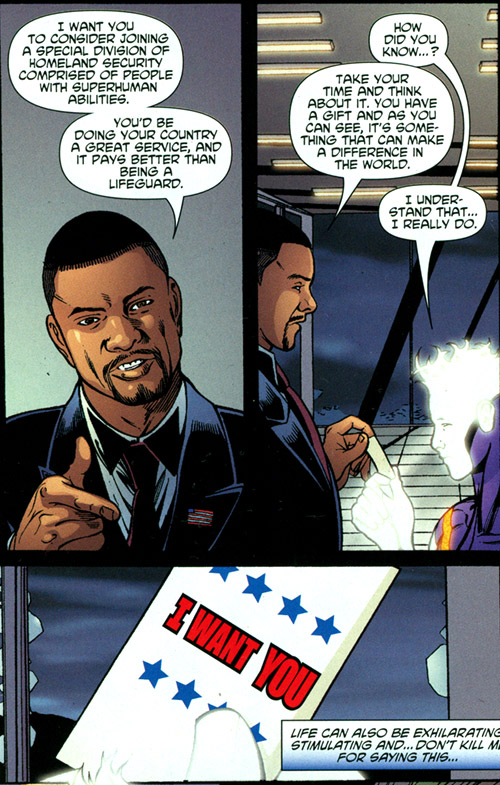 Later, after averting a terrorist kidnapping, the Ray was approached by a very tall man who offered him an opportunity. He ran a special division of Homeland Security comprised of people with metahuman abilities, and handed the Ray a card that read "I WANT YOU." (#4)
