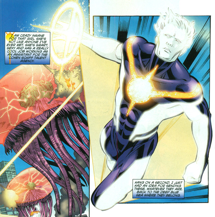 Gates was transformed by the energies of an experimental military "sun gun." It fired across the planet's surface, affecting living things in various ways. In San Diego, it transformed Lucien into a living light construct. Use of his powers came instinctively and he found himself accelerating up the west coast, landing in Seattle. To his embarrassment, Gates also found that his clothing had burned off and he could not don any new clothes, either. But he soon figured out that he had the ability to create the illusion of clothing by manipulating others' perception of the light around him. His parents recommend that he seek out help from other super-heroes and his girlfriend, Chanti that he go to the emergency room.