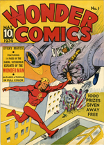 Interestingly, in 1939, Eisner & Iger created a red-clad hero named Wonder Man for Fox Features Syndicate (Wonder Comics #1, May 1939), but they were sued by National (DC) for it being too similar to Superman. (The entire Wonder Man story was reprinted in Alter Ego #48 (May 2005). It’s also available at Golden Age Comics Downloads)